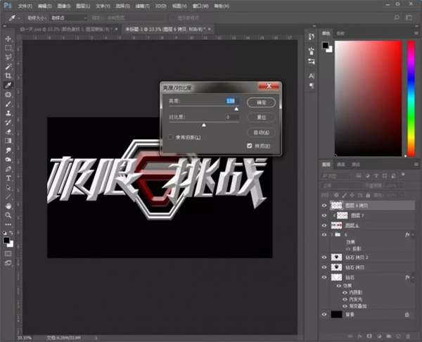 11、复制一层文字图层,填充颜色,添加调整图层【亮度/对比度】,轻移位置;