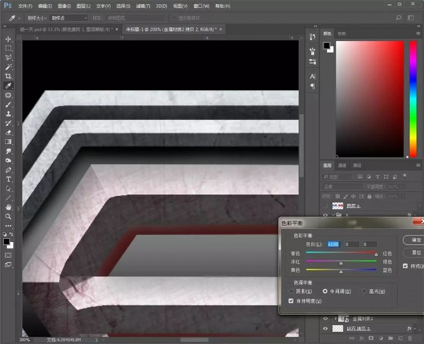 13、给“6”字上方的金属材质素材添加【色彩平衡】,把红色拉到最大,重复添加,直至变红。然后把铁锈纹理素材拖入场景,添加【黑白】;
