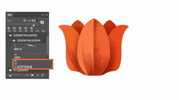 在花朵的上半部分添加一些不规则的白点,呈现出亮晶晶的效果,用【不规则网格肌理笔刷】添加网点效果,丰富物体层次。
