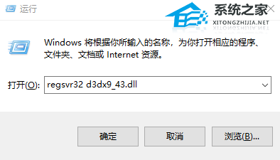 3. 按Win+R打开运行,输入regsvr32 d3dx9_43.dll,点击回车,注册dll。
