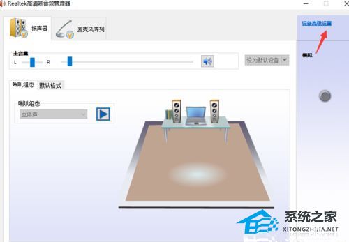 4. 打开“Realtek高清晰音频管理器”菜单,如图所示。点击右上角的“设备高级设置”。