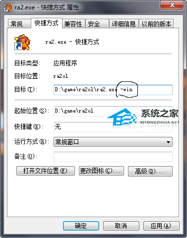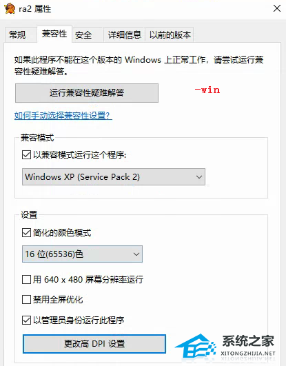 路径 、dpi设置好后,在游戏目录找到Ra2.exe(尤里复仇为Ra2md.exe),创建一个快捷方式,右键找到“属性”,打开“快捷方式页面”,把“目标”后面加上“空格-win”(不要漏掉“-”),再打开“兼容性”选择“用兼容运行”并选择pack2,向下,显示模式设置为16位,最后用管理员模式运行,点击确定,然后就可以打开玩了。