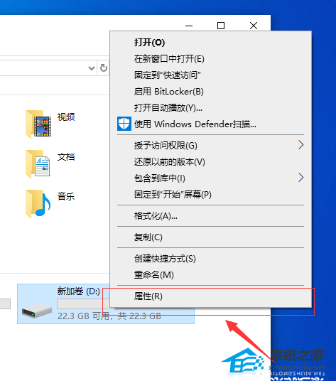 1. 右键点击D盘,在打开的菜单项中,选择属性;