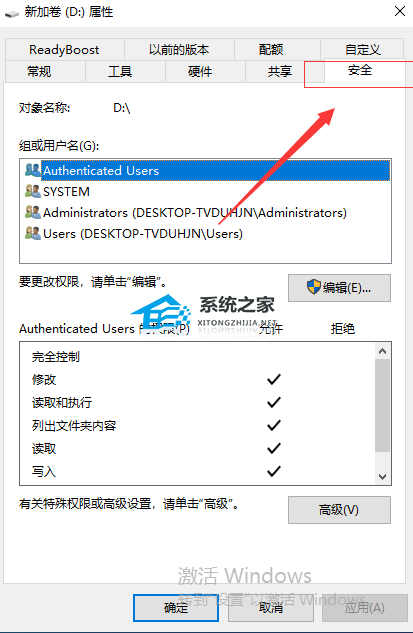 3. 安全选项卡下,查看组或用户名,这几个用户是否全在在列表中;