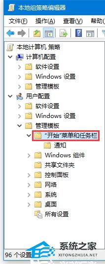 2. 在左侧的窗格中依次定位到“用户配置-管理模板-开始菜单和任务栏”。