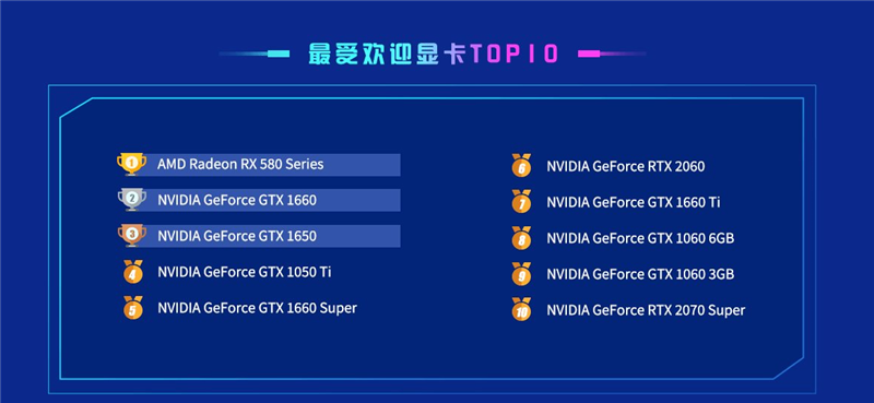 下图是鲁大师2021年最受欢迎显卡top10排行榜,在这份榜单中amd的显卡终于勇夺第一,冠军由amd Radeon rx 580 series获得。