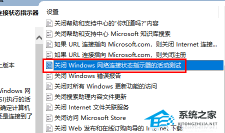 3、在设置列表中找到“关闭windows网络连接状态指示器活动测试”,双击打开。