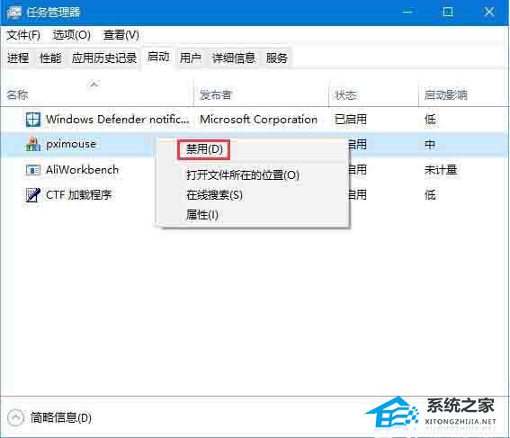 3. 在任务管理器中的pximouse上单击右键,选择“禁用”即可。