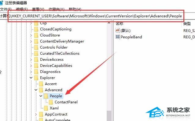 定位到相关文件夹:在注册表编辑器中定位到 “HKEY_CURRENT_USER\Software\Microsoft\Windows\CurrentVersion\Explorer\Advanced\People”。