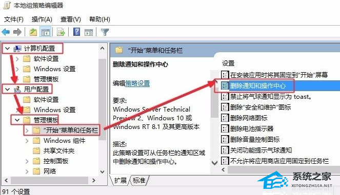 6. 这时候点击用户配置-管理模版-开始菜单和任务栏,右边点击删除通知和操作中心打开进入,如图所示进行操作即可。