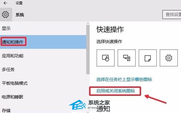 3. 通知和操作中我们点击这里的启用或关闭系统图标。