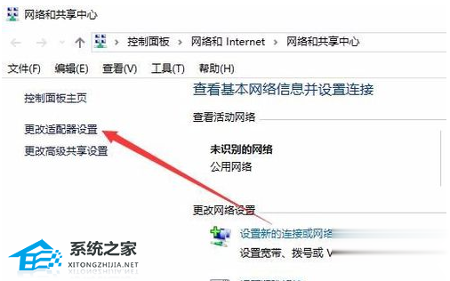 在打开的网络和共享中心窗口中,我们点击左侧的“更改适配器设置”快捷链接。