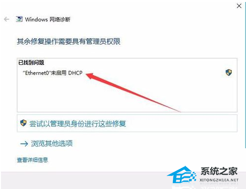 一会网络诊断工具就会找到网络问题,会在窗口中显示出来,如果需要网络诊断工具修复网络的话,我们点击“尝试以管理员身份进行这些修复”快捷链接。