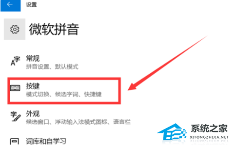 8. “微软拼音”设置窗口中,单击“按键”选项。