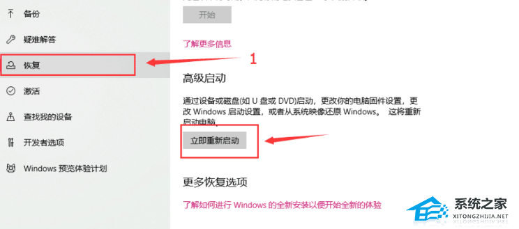 3. 我们在”更新和安全页面“找到左侧的恢复选项,在右侧选择”立即重新启动“。