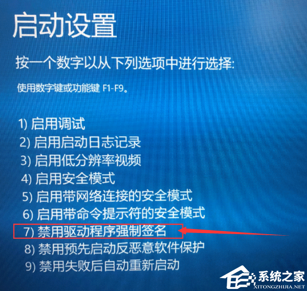 8. 系统重新启动以后在启动设置页面按“7”7或者“F7”选择禁用驱动程序强制签名即可。