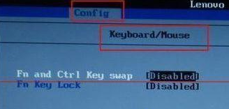 3、然后在bios中依次打开 CONFIG -- Keyboard/Mouse -- Change to "f1-f12 key或Hotkey Mode 设置为Legacy兼容模式或D开头的disabled字样即可。