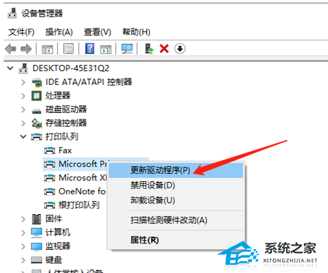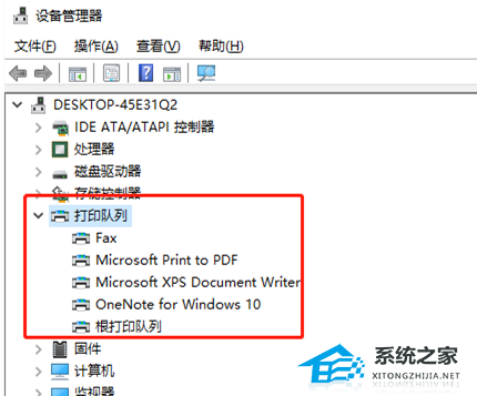 2. 设备管理器窗口,在打印机队列中,找到并选择【有问题的打印机】;