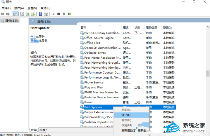 2. 服务窗口,找到名称为【Print Spooler】服务,并点击【右键】,在打开的菜单项中,选择【停止】;