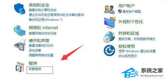 3. 控制面板窗口,找到并点击程序下的【卸载程序】;