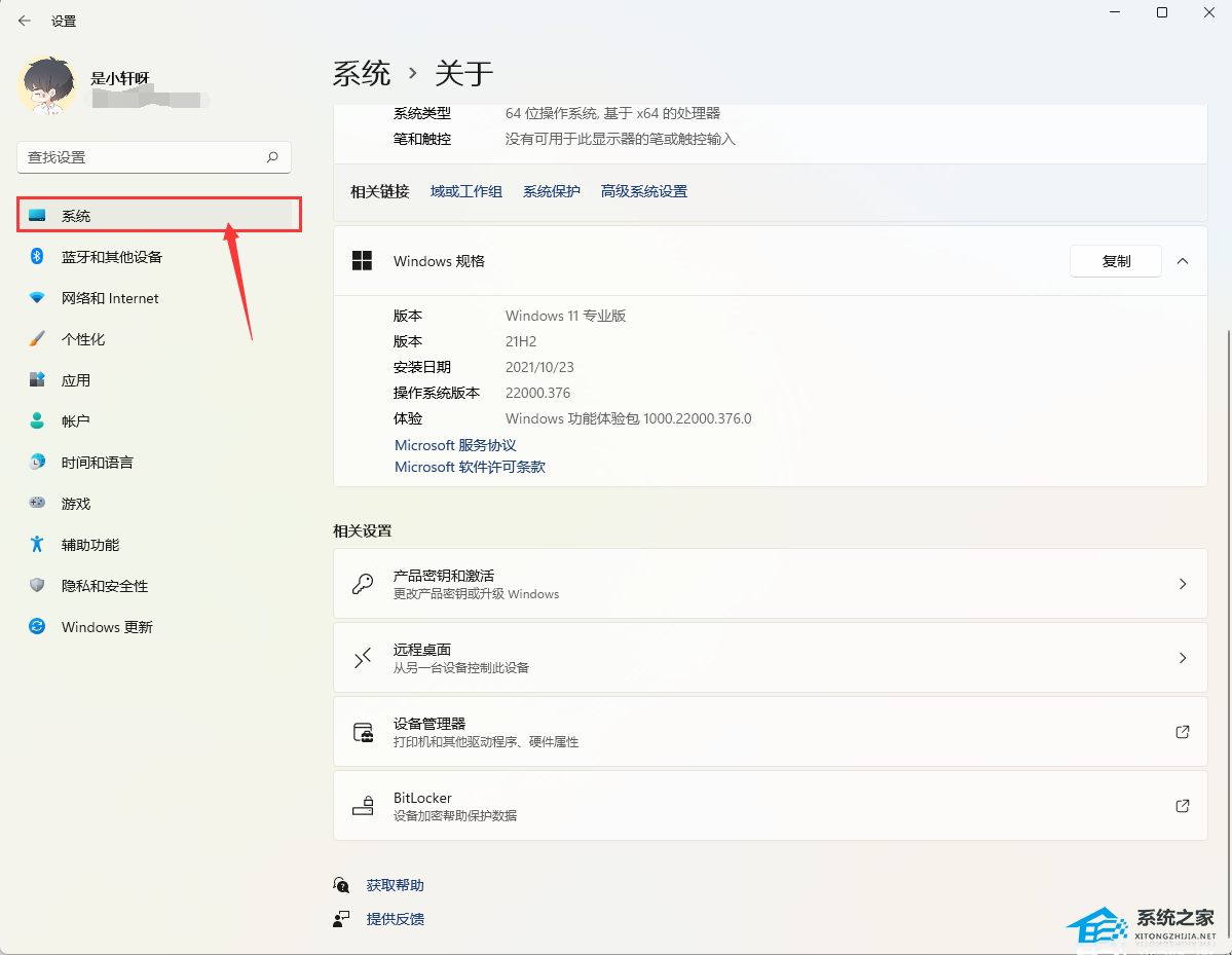 1. 按下Win+i组合键打开设置,在该界面点击【系统】,在打开的界面左侧选择栏移动到最下面,我们可以看到“关于”选择,点击它。