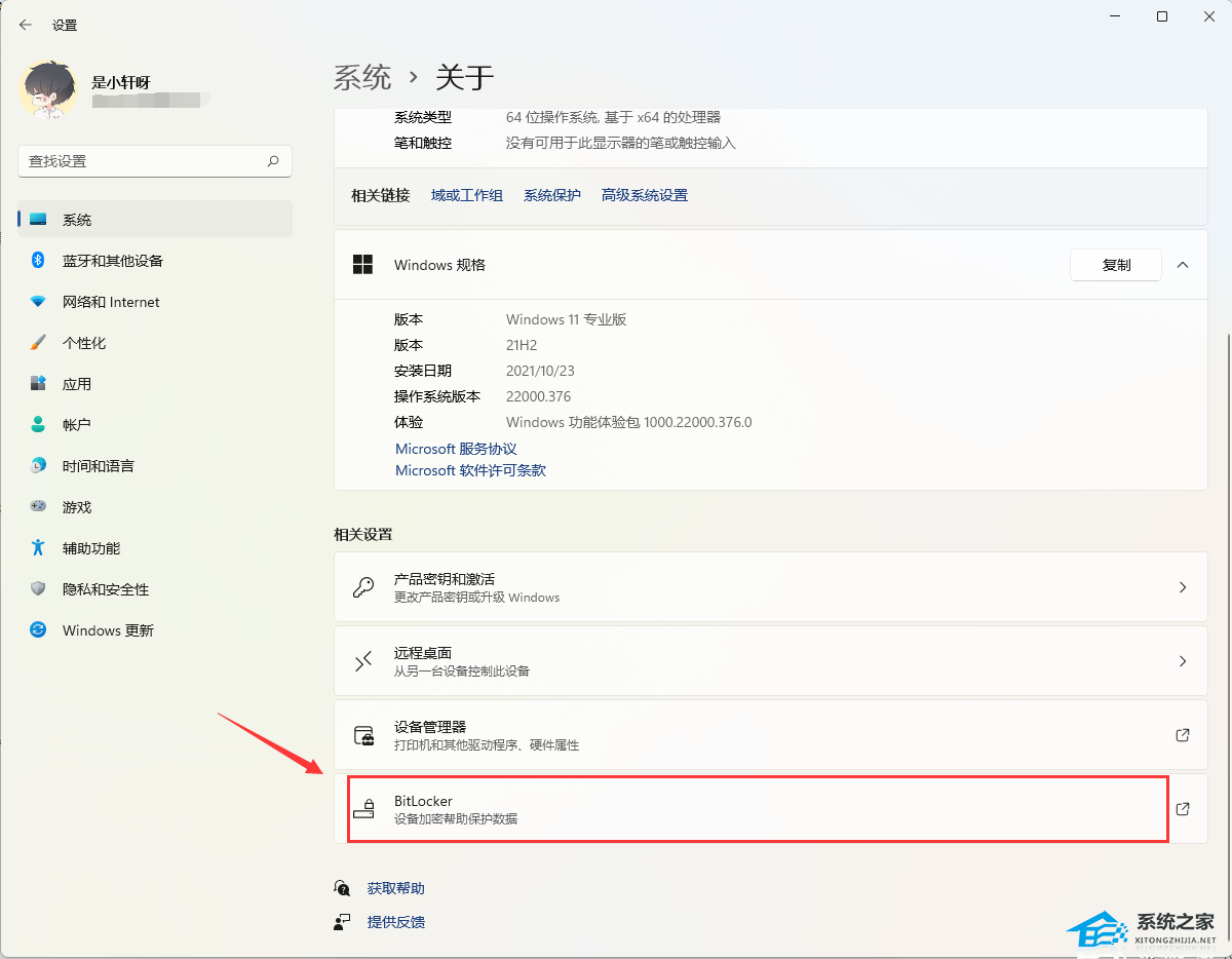 2. 在“关于”选项右侧设置界面移动到自动最下面,在相关设置下点击【BitLocker设置】。