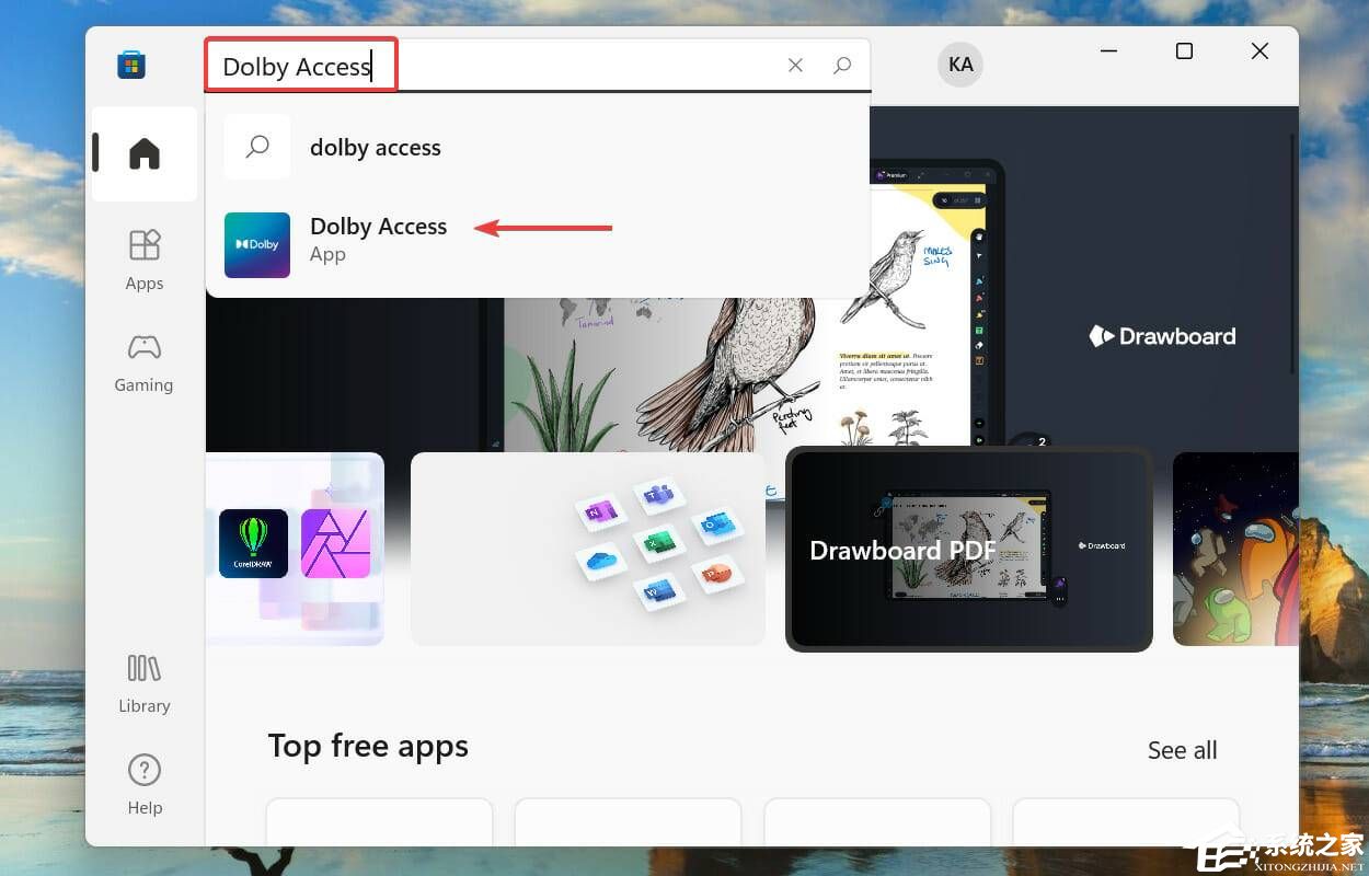 在微软应用商店的搜索框中输入“DolbyAccess”,然后点击搜索结果中的“DolbyAccess”应用。