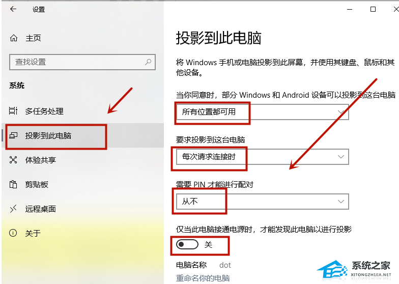 2. 在列表中点击选择“投影到此电脑”,在窗口右边对投影进行设置。