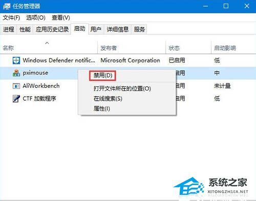在任务管理器中找到pximouse,单击右键选择 “禁用” 即可。