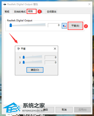 4. 在属性窗口中先点击上方的【级别】选项卡,再点击【平衡】按钮,这样就可以调整音频设备的左右声道输出了。