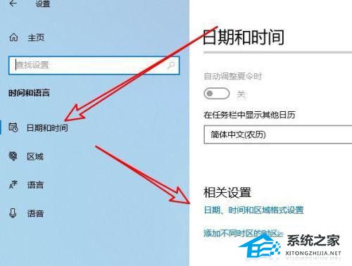 3. 在打开的时间和语言窗口当中,我们点击左侧边栏的日期和时间的菜单项,然后在右侧窗口当中找到日期时间和区域格式设置快捷连接。