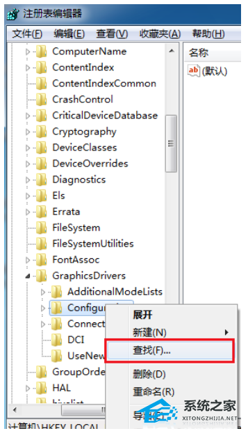 2. 在打开的注册编辑器中按照顺序依次打开HEKY_LOCAL_MACHINE>SYSTEM>ControlSet001>Control>GraphicsDrevers>configuration。在configuration上右击选择“查找”。