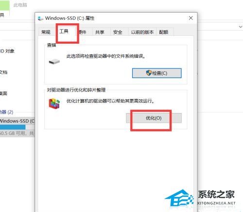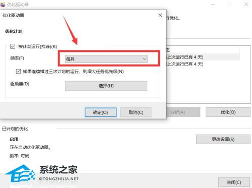 2. 在弹出来的页面中,点击“工具”选项,点击“优化”按钮,在页面中找到“已计划的优化”,点击右边的“更改设置”选项,然后选择一个月一次,点击确定即可。