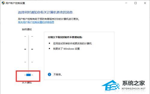 2. 点击“更改用户账户控制”,把所有的通知下滑到从不通知,点击确定即可。