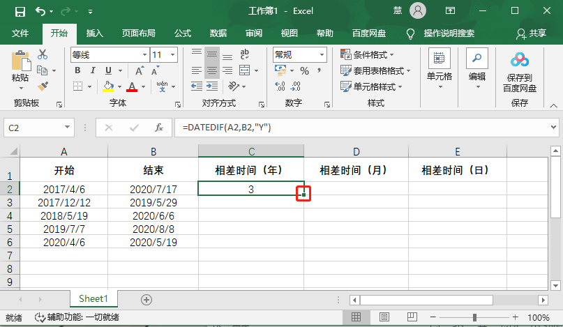 4、点击第一个相差年份结果所在的单元格,拉动右下角的【填充键】下拉填充,直接套入公式获得结果;