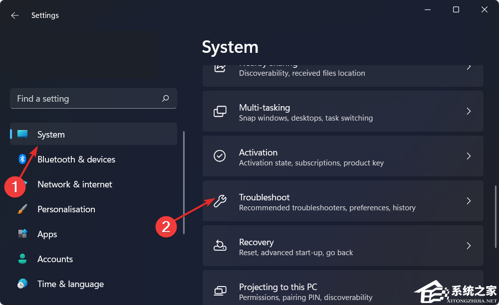 1. 按住Windows键 +并从左侧面板I导航到系统,然后是疑难解答。