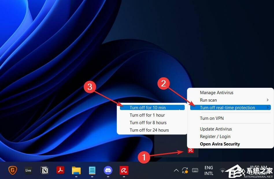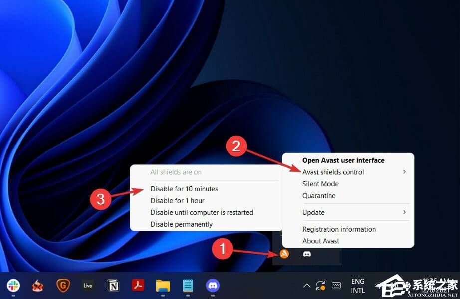 1. 展开右侧任务栏中的图标,然后右键单击防病毒软件。选择Avast shields control然后禁用10分钟。