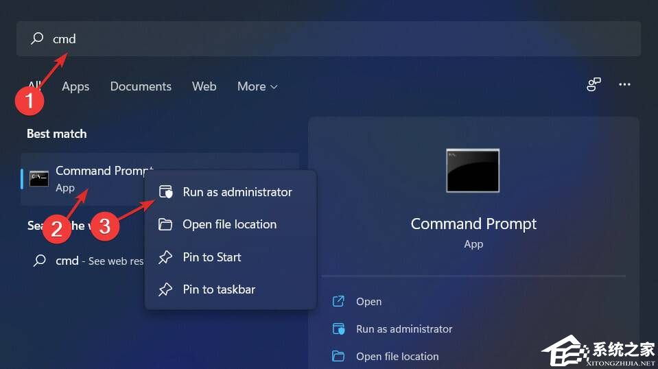 1. 通过在Windows搜索功能中键入cmd并右键单击它,以管理员身份打开命令提示符。