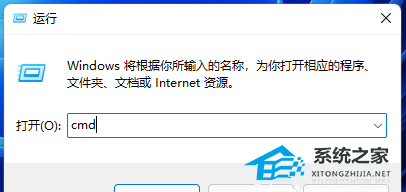 2. 运行窗口,输入cmd命令,按确定或回车,打开命令提示符窗口。