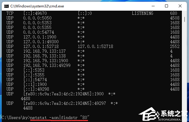 4. 如果想要查找特定的端口,可以输入并回车执行netstat-aon|findstr“端口号”命令,例如:netstat-aon|findstr“80”,即为查找端口号为80的信息。