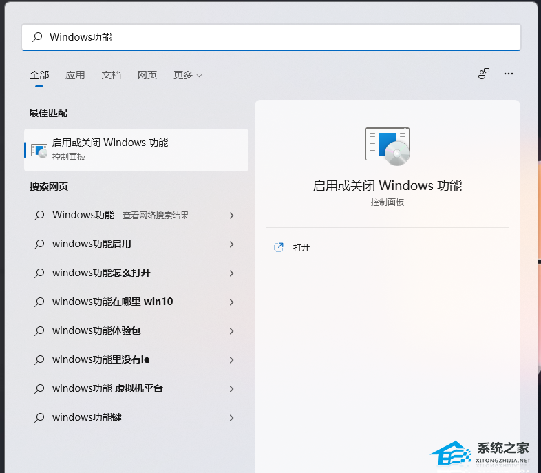 2. Windows搜索窗口,顶部搜索框,输入Windows功能,然后点击打开系统给出的最佳匹配启用或关闭Windows功能。