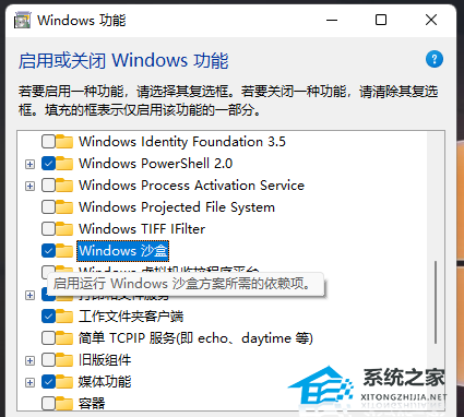 3. Windows功能窗口,找到并勾选Windows沙盒(启用运行Windows沙盒方案所需的依赖项)。