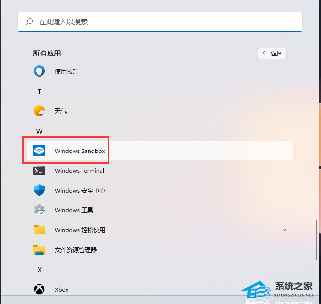 6. 接着,点击开始菜单,在所有应用下,就可以找到刚才添加的WindowsSandbox了。