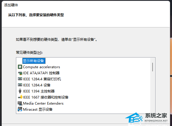 5. 从以下列表,选择要安装的硬件类型,如果看不到想要的硬件类型,请单击“显示所有设备”。