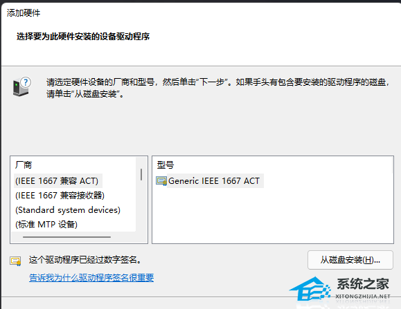6. 选择要为此硬件安装的设备驱动程序,请选定硬件设备的厂商和型号,然后单击“下一步”。如果手头有包含要安装的驱动程序的磁盘,请单击“从磁盘安装”。