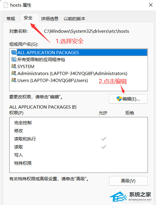 4. 切换到【安全】选项卡,然后点击【编辑】;