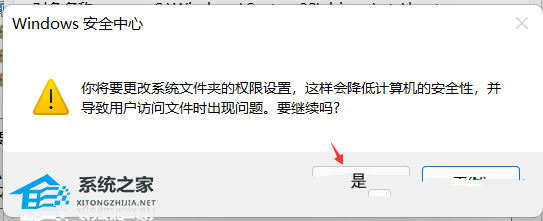 7. Windows 安全中心提示,你将要更改系统文件夹的权限设置,这样会降低计算机的安全性,并导致用户访问文件时出现问题。要继续吗?点击【是】;
