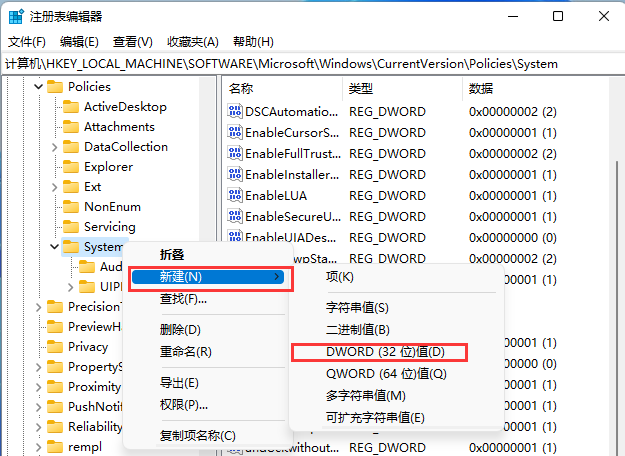 2、右键点击 System,在打开的菜单项中,点击新建 DWORD (32位)值(D),并且命名为 DisplayLastLogonInfo ,同时还要修改数值数据为 1,如果本身就有该值的话,直接修改数值数据即可。