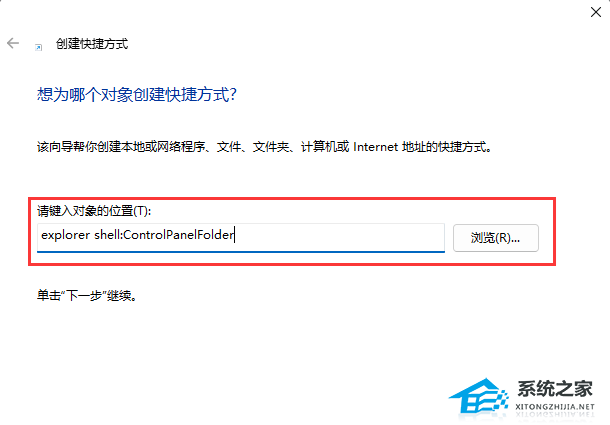 2. 创建快捷方式窗口,请键入对象的位置,输入【explorer shell:ControlPanelFolder】,然后点击【下一页】。