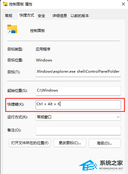 5. 控制面板 属性窗口,【快捷方式】选项卡下,还可以设置快捷键。